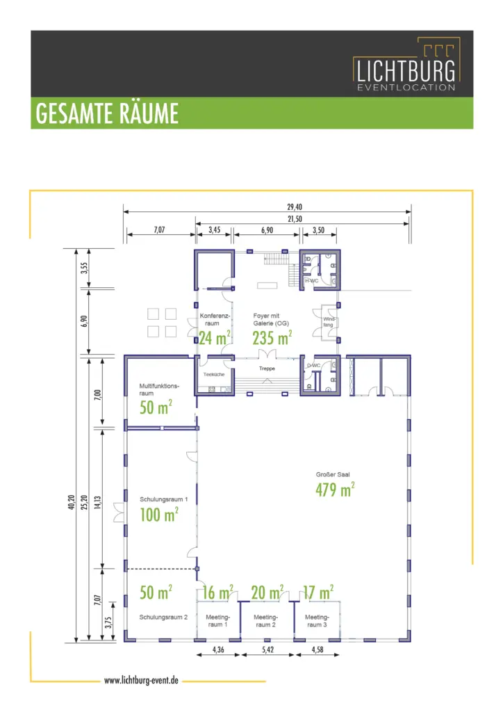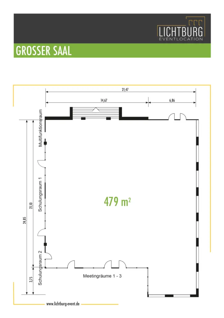Grundrisse der gesamten Location und der einzelnen Räume finden sich als Download auf der Website. Dabei wird kontinuierlich mit der Rahmung im Gelbton gearbeitet, während der Grünton beispielsweise für die Raumflächen zum Einsatz kommt.