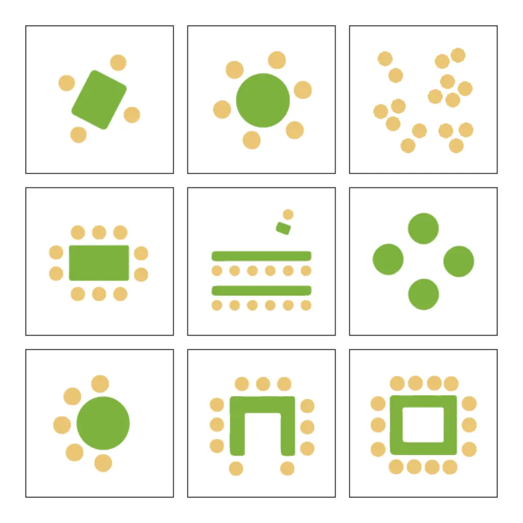 Als weiteres gestalterisches Detail gibt es eigene Piktogramme zur Beschreibung der Nutzung der jeweiligen Räume. Dabei werden Tische in der Regel als grüne Flächen dargestellt und Stühle als gelbe Kreisflächen. Somit zieht sich das Farbschema auch kontinuierlich durch diesen Bereich.