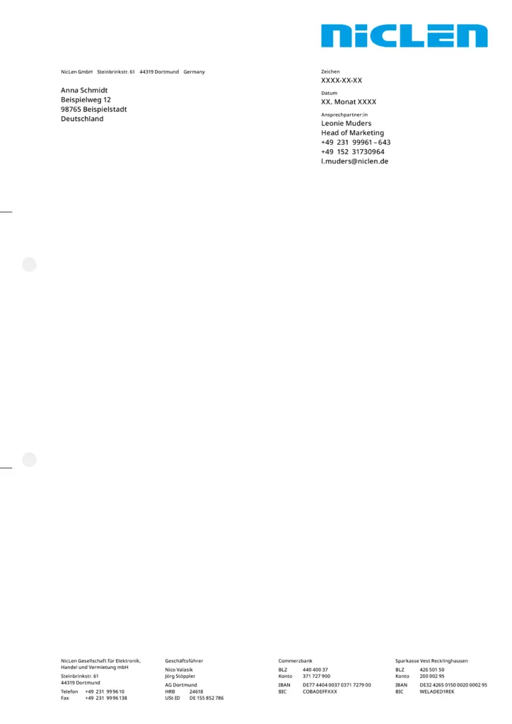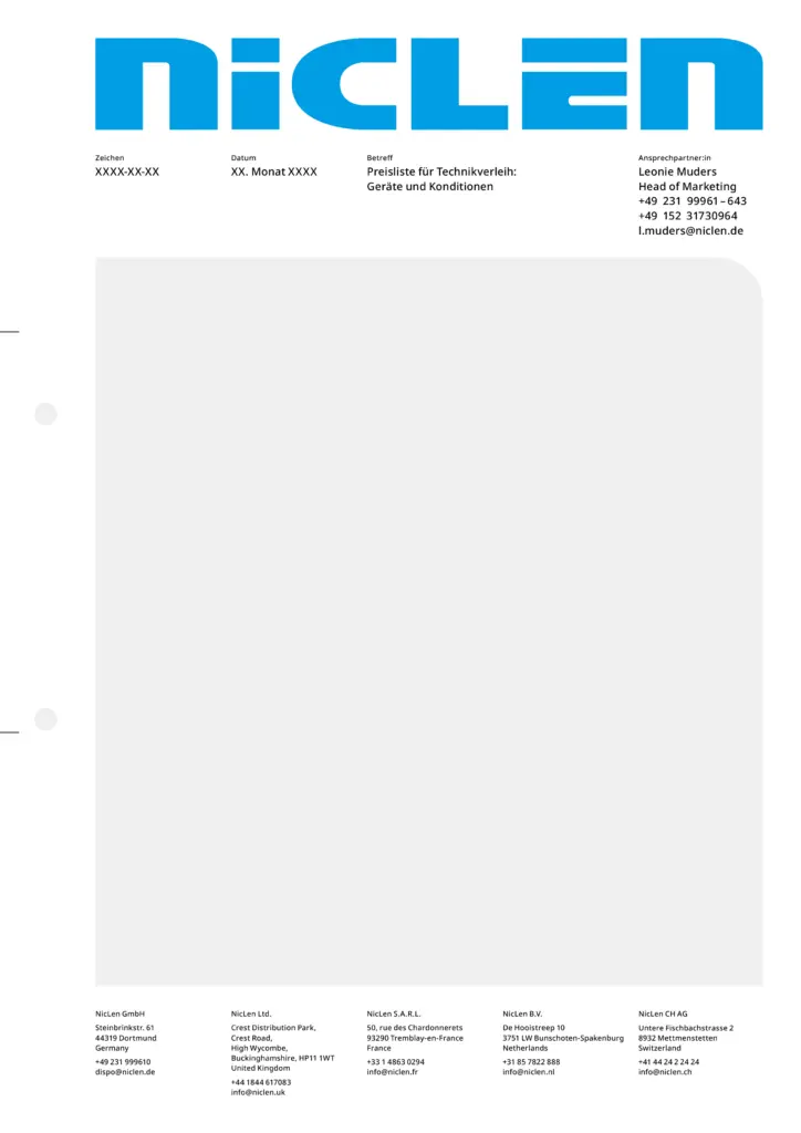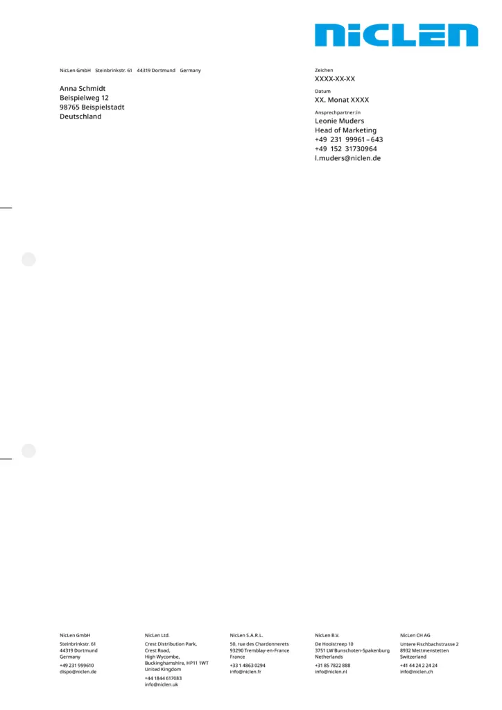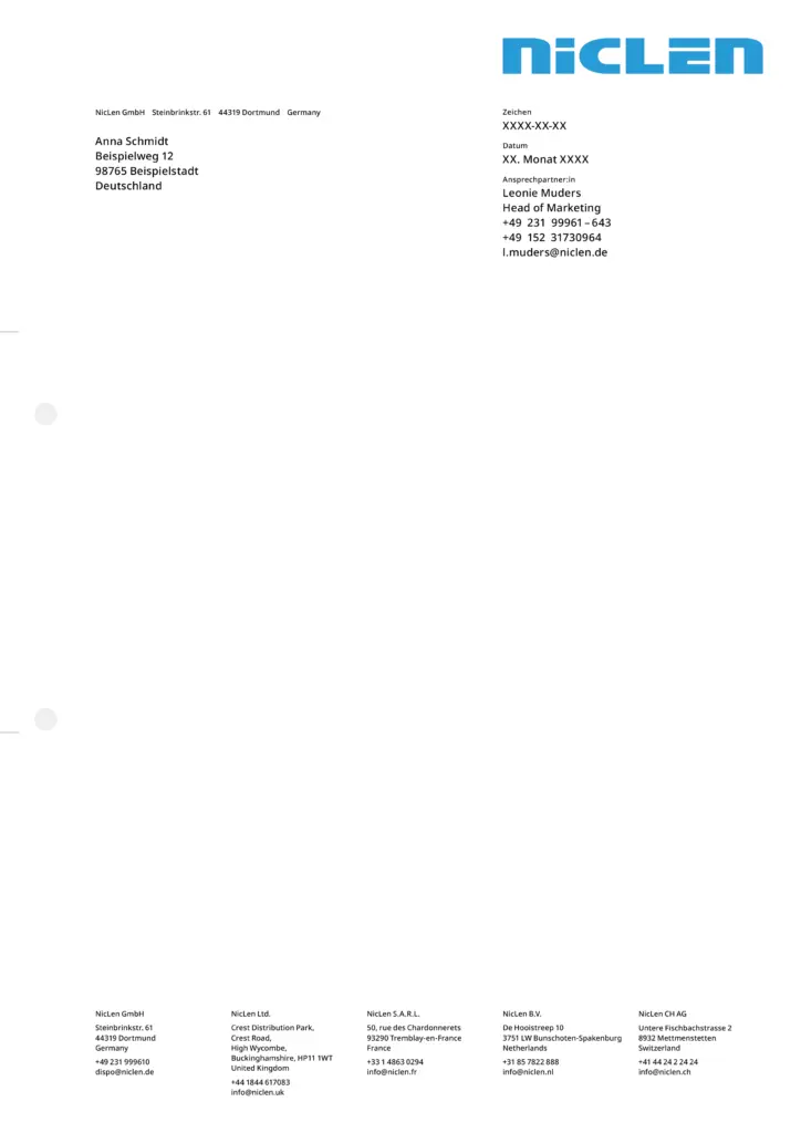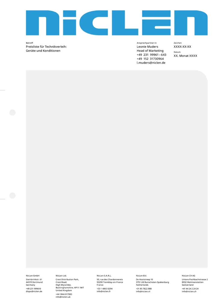 Briefpapiere enthalten grundsätzlich die Wortmarke gemäß ihrer vorgegebenen Anwendung am oberen Rand. Der Hintergrund bleibt entweder weiß oder wird mit einem einzelnen Gestaltungselement großflächig gefüllt. In der Fußzeile sind die Anschriften sämtlicher NicLen-Standorte gleichmäßig nebeneinander angeordnet. Weitere Elemente hängen vom konkreten Verwendungszweck des Briefpapiers ab. In der Regel befinden sich dann einfarbige Balken über der Fußzeile, die sich über die Gesamtbreite des Layouts erstrecken. Bei Angeboten ist hier Raum für Service-Hinweise.