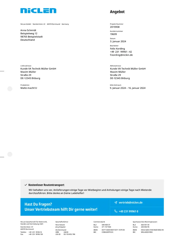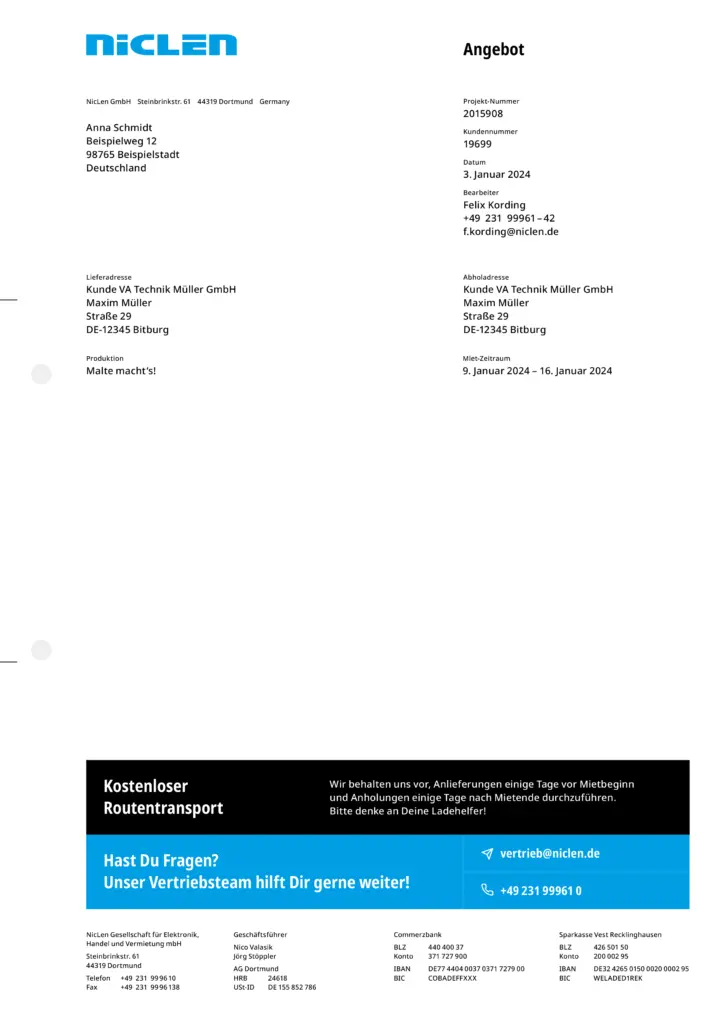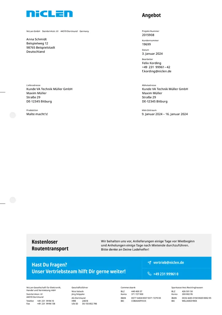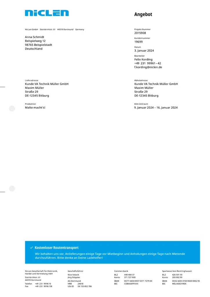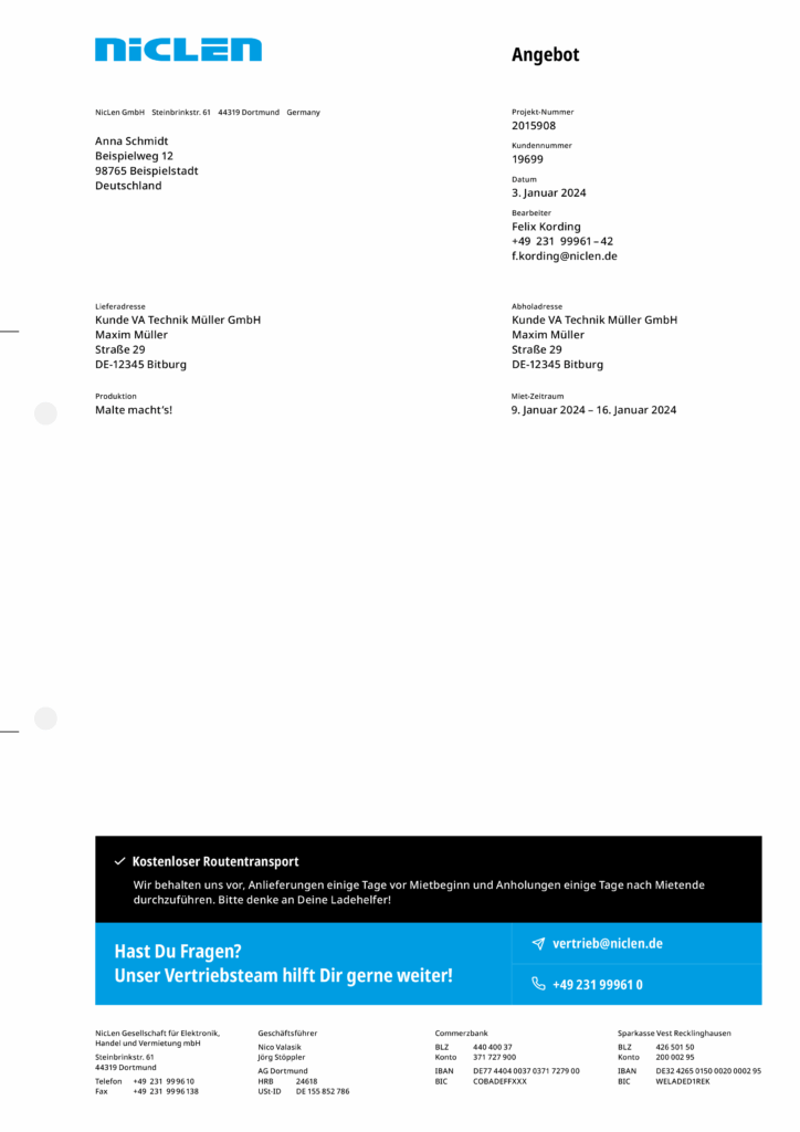 Briefpapiere enthalten grundsätzlich die Wortmarke gemäß ihrer vorgegebenen Anwendung am oberen Rand. Der Hintergrund bleibt entweder weiß oder wird mit einem einzelnen Gestaltungselement großflächig gefüllt. In der Fußzeile sind die Anschriften sämtlicher NicLen-Standorte gleichmäßig nebeneinander angeordnet. Weitere Elemente hängen vom konkreten Verwendungszweck des Briefpapiers ab. In der Regel befinden sich dann einfarbige Balken über der Fußzeile, die sich über die Gesamtbreite des Layouts erstrecken. Bei Angeboten ist hier Raum für Service-Hinweise.