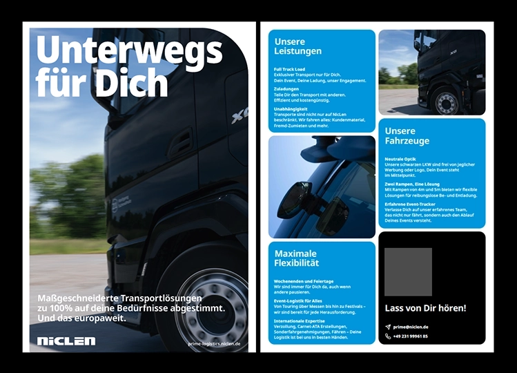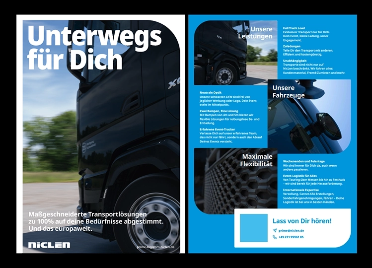 Flyer haben in der Regel eine klar erkennbare Vorder- und Rückseite. Die Vorderseite beinhaltet die Wortmarke gemäß ihrer vorgegebenen Anwendung am unteren Rand. Davon abgesehen ist die Vorderseite inhaltlich sehr reduziert gestaltet mit wenig Text. Der Fokus soll neben einem Titel und einer klaren Werbebotschaft mehr auf dem Spiel mit Gestaltungselementen und Bildmaterial liegen und als Eyecatcher dienen.