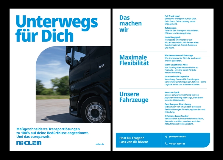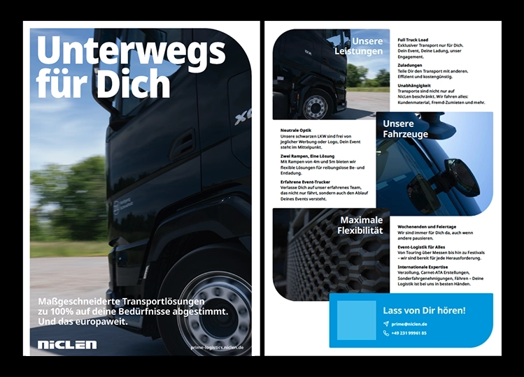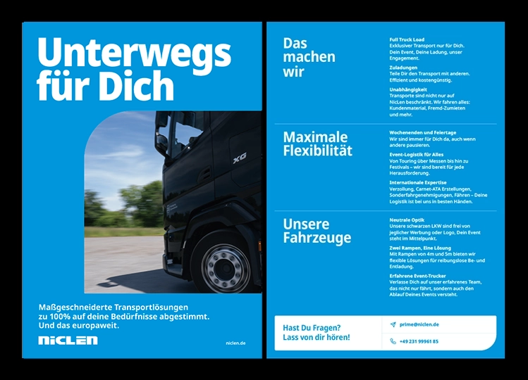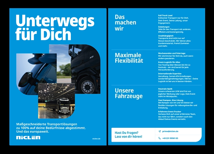 Auf der Rückseite ist Raum für ausführlichere Informationen, längere Texte und Kontaktinformationen. Sie können minimalistisch gestaltet eingebracht werden oder die Bildsprache mit weiteren Gestaltungselementen und Bildern fortführen. Kontaktinformationen schließen die Rückseite am unteren Rand ab und heben sich auch farblich noch einmal vom Rest der Seite ab.
