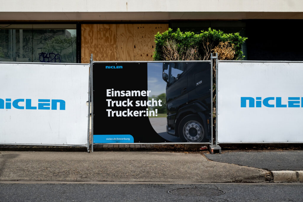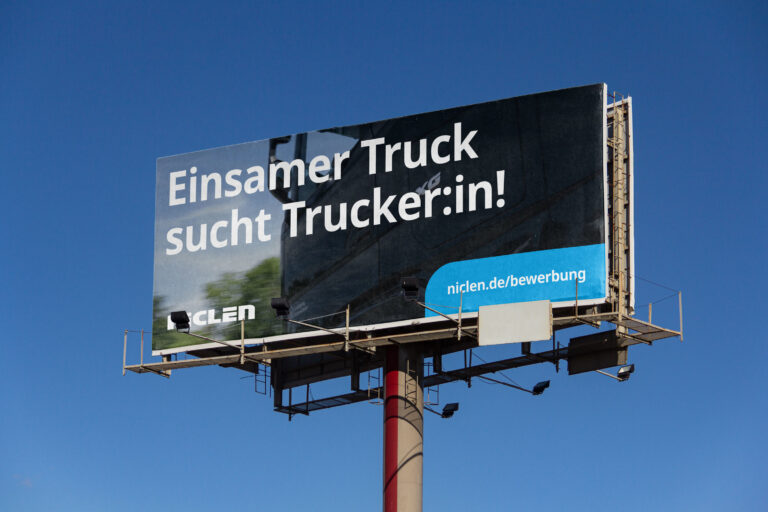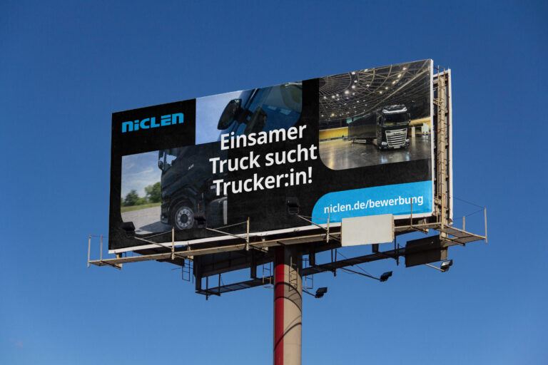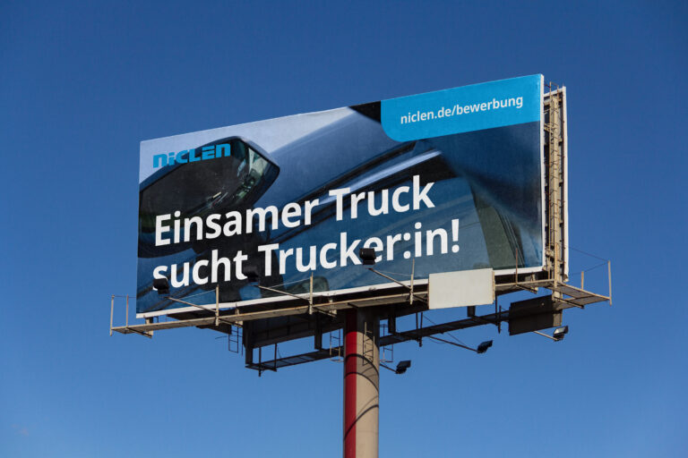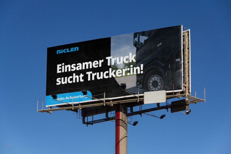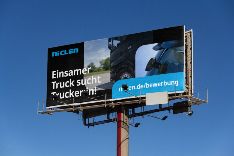Wenn wir Plakatwände und andere besonders große Flächen mit Inhalten/Werbung bespielen, soll der Fokus eher auf Bildgestaltung und weniger auf längeren Textinhalten liegen. Im Wesentlichen ist es wichtig, die Wortmarke einzusetzen, um als Unternehmen direkt erkennbar zu sein. Denn Werbung im öffentlichen Raum richtet sich nicht ausschließlich an eine Zielgruppe, die das Unternehmen bereits kennt.