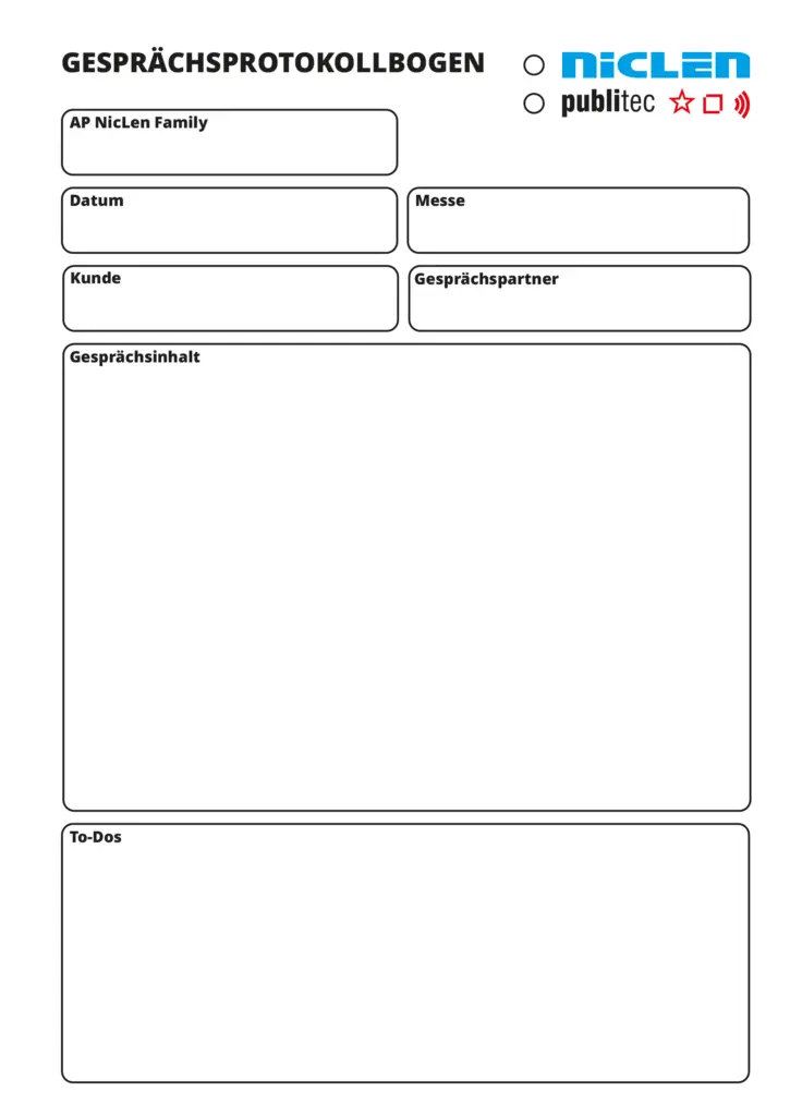 Printmittel ohne großen werblichen Anspruch wie Notizblöcke oder Gesprächsprotokoll-Bögen beinhalten in erster Linie die gemeinsam platzierten Logos. Möglich ist auch eine ergänzende Platzierung der NicLen Family Website.