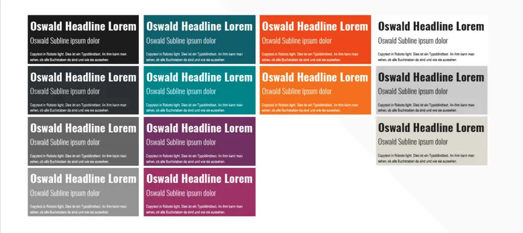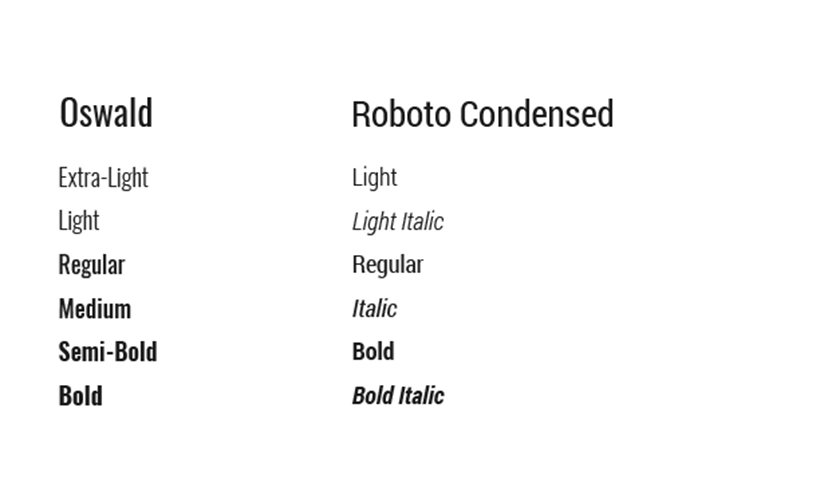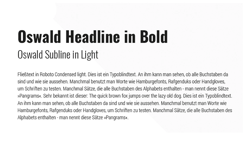 Oswald und Roboto Condensed in verschiedenen Schriftschnitten.