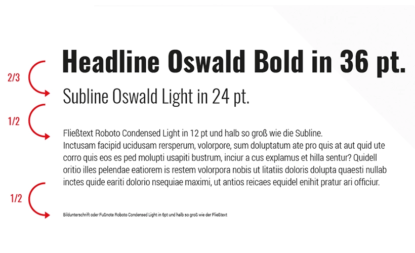 Die Schriftgröße der Subline beträgt stets zwei Drittel (2/3) der Headlinegröße.